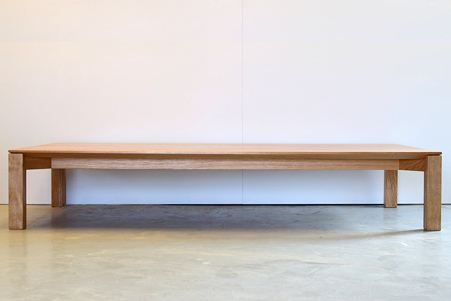 長さ1800mm、天厚33mmとサイズ的には重厚なローテーブルですが、普段見る目線からはそれを感じさせないシンプルですっきりしたデザインになっています。 少し目線を落とすと、天板や幕板の"斜め45°"が控えめにも個性を放つ形状になっています。