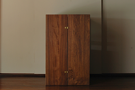 両面から出し入れでき180°まで開くことができるので、間仕切りとして使用したり、また90°開いてコーナーに置いても楽しめます。真鍮の留め具や蝶盤がアクセントになっています。